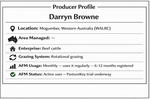 “AFM has transformed how I manage pasture. What used to take 50 days a year now takes five. I use it regularly - before planning rotations, during dry spells, when I’m looking ahead at the season. It’s become central to how I run the operation.” - Darryn Browne, Browne Livestock, Mogumber WA |