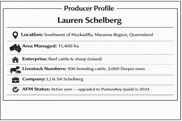 Running a dual-enterprise operation across 11,400 hectares in southwest Queensland’s Maranoa region is no small task. Lauren Schelberg manages 500 breeding cattle and 2,000 Dorper ewes alongside her husband on their family property, LJ & SA Schelberg, located southwest of Muckadilla. The country is typical of the region, variable in its response to rainfall and unforgiving when seasons turn.